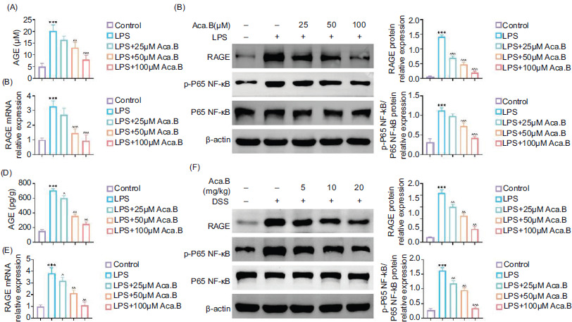 Figure 5 Aca.B inhibits the AGE/RAGE pathway in LPS-stimulated MODE-K cells and dextran sulfate sodium (DSS)-induced ulcerative colitis mice. (A) The expression of AGE in MODE-K cells treated with LPS or Aca.B. (B) The mRNA expression of RAGE in MODE-K cells treated with LPS or Aca.B as detected by qRT-PCR. (C) Expressions of RAGE, p-P65, and P65 were determined in MODE-K cells treated with LPS or Aca.B using immunoblotting analysis. The grayscale value of the corresponding band was quantitated with ImageJ. ***P < 0.001, compared with the control group. ^^P < 0.01 and ^^^P < 0.001, compared with the LPS group. (D) Expression of AGE in tissue samples from DSS-induced ulcerative colitis. (E) The mRNA expression of RAGE in tissue samples from DSS-induced ulcerative colitis as detected by qRT-PCR. (F) Expressions of RAGE, p-P65, and P65 were determined in tissue samples from DSS-induced ulcerative colitis using immunoblotting analysis. The grayscale value of the corresponding band was quantitated with ImageJ. ***P < 0.001, compared with the Sham group. ^P < 0.05, ^^P < 0.01, and ^^^P < 0.001, compared with the DSS group. Aca.B: Acanthoside B.