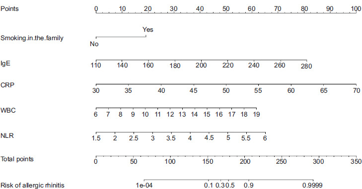 In the training cohort, children with bronchial asthma were included in a multivariate logistic regression model with the presence of allergic rhinitis as the dependent variable, and smokers in the household, IgE, CRP, WBC, and NLR as the independent variables.