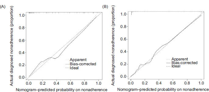 Figure 2 Calibration curve of the nomogram model for predicting comorbid allergic rhinitis in children. (A) Training cohort, (B) Validation cohort.