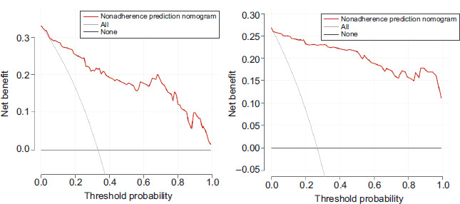Figure 3 DCA curve of the nomogram model to predict the complication of allergic rhinitis in children. (A) Training cohort, (B) Validation cohort.