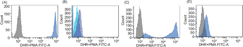 Figure 1 Neutrophil oxidative burst test using the dihydrorhodamine (DHR) assay. (A) Control sample showing the normal shift of activated neutrophils (blue) compared to unstimulated neutrophils (gray); (B) DHR of a patient with a mutation in CYBB showing the absence of a shift in stimulated neutrophils; (C) DHR of an X-linked carrier of a CYBB defect showing a bimodal population of stimulated neutrophils; (D) DHR of a female patient with autosomal recessive CGD and a defect in NCF1.
