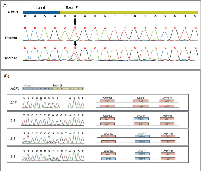 Figure 2 Sanger sequencing electropherograms of the CYBB gene (2A) and NCF1 and pseudogenes NCF1B and NCF1C (2B). (A) the first line represents the reference sequence, with the black arrow indicating a single-nucleotide substitution, c.676C>T in exon 7, in an X-CGD patient. The third line shows heterozygosity for the same mutation in the maternal DNA. (B) the first line represents the GTGT sequence configuration in exon 2 of the NCF1 gene and the ΔGT sequences in exon 2 of the pseudogenes NCF1B and NCF1C. The Δ47 sample shows a patient with copies of the NCF1 gene converted from GTGT to ΔGT, indicating the disease condition. The graphical representation elucidates the genomic configurations for each sample, illustrating the presence and ratios of GTGT and ΔGT sequences.