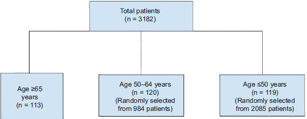In this retrospective study, we reviewed the records of a total of 3182 patients who visited our clinic between December 1, 2022, and December 1, 2023. During this period, there were 113 elderly patients and whose information regarding patient records could be fully accessed. All individuals aged over 65 years who visited the outpatient clinic within a 1-year period were included using a total population sampling approach, as the group size was relatively limited. Additionally, through randomization, 119 patients under the age of 50 and 120 middle-aged patients were selected from among the 2085 patients under 50 and 984 middle-aged patients who visited our clinic during the same period. For the age groups between 50 and 65 years and under 50 years, the simple random sampling method was employed to ensure comparability across age categories. Specifically, from each of these two larger age groups, participants were randomly selected to match the sample size of the ≥ 65 age group. Randomization was performed using computer-generated random numbers in Microsoft Excel where each eligible patient was assigned a random number and the dataset was sorted accordingly. The first 119 patients under the age of 50 and 120 middle-aged patients were then selected. This approach ensured that selection bias was minimized and where each individual within the age groups had an equal probability of being included in the study. The flowchart of the patient selection process employed in the study is presented in Figure 1. Data regarding the patients, including age, sex, type of allergic disease, triggering factors of the disease, additional systemic diseases, and results of skin prick tests, were obtained.