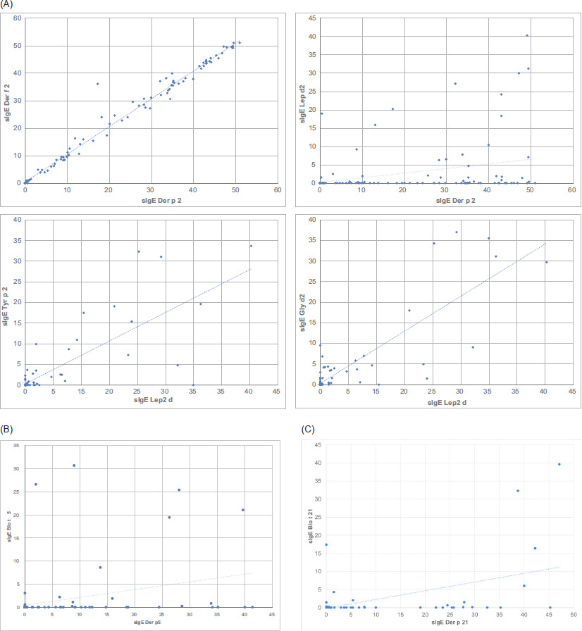 ImmunoCAP sIgE levels for Der p and Lep d were significantly associated with the number of mite allergen sensitizations (r = 0.65, p < 0.001; and r = 0.5, p < 0.001, respectively). Except for Der p 10, sIgE levels for all mite allergens measured with the ALEX2 diagnostic platform showed a positive correlation with the number of mite allergen sensitizations (shown in Table S1).