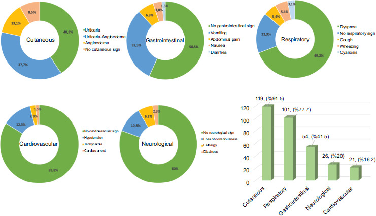 The present study constitutes an evaluation of pediatric anaphylaxis cases according to age and trigger over 11 years. As demonstrated in previous studies involving children,9,10 the present study found that more than half of the cases (83, 63.8%) were male. The role of gender in the pathogenesis of anaphylaxis remains to be elucidated.11 However, anaphylaxis manifests more frequently in boys until the age of 10–15 years; afterward, a higher incidence is observed in girls.10 The present study revealed a high male-to-female ratio in all groups, encompassing infants, preschool children, school-age children, and adolescents. The most prevalent findings were cutaneous symptoms (91.5%), followed by respiratory (77.7%), gastrointestinal (41.5%), neurological (20%), and cardiovascular (16.2%) findings. These findings are consistent with the literature.9,10