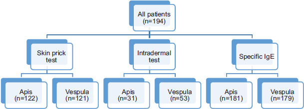 The case history of 194 patients who applied to the allergy and immunology outpatient clinic of Adana City Hospital, Adana, Türkiye, between January 01, 2018 and May 01, 2024 were reviewed retrospectively. Age, gender, place of residence, atopy, comorbidities, medications used, and whether they were beekeepers or not were recorded. In addition, the type of bee that stung them was noted based on the patient’s history. Clinical manifestations of the patient after bee sting, emergency room visits, and treatments they received were also noted. Skin prick tests (SPTs) and IDT performed on the patients and HV sIgE values were recorded. HV sIgE positivity was determined by ThermoFisher Scientific ImmunoCAP. The classification in this method is as follows: class 0: <0,35 kilo units per liter (kU/L) (no allergy), class 1: 0.35–0.7 kU/L (low positive allergy), class 2: 0.70–3.5 kU/L (positive allergy), class 3: 3.50–17.5 kU/L (strong positive allergy), class 4: 17.5–50 kU/L (high positive allergy), class 5: 50–100 kU/L (very high positive allergy), and class 6: ≥100 kU/L (extremely positive allergy). According to this classification, values ≥ 0.35 kU/L are positive and <0.35 kU/L are negative.8 SPTs were performed with Apis and Vespula venoms, positive and negative controls. Histamine 10,000 mL was used as a positive control and 0.09% sodium isotonic was used as a negative control. For SPT >3 mm from the negative control was accepted as a positive test result. IDT was performed with 0.02–0.05-mL injection, which created a 2–3-mm blep/induration on the skin. Patients with induration larger than the injected diameter were accepted as positive. IDT is more sensitive than SPTs. SPT with venom concentrations of 10 µg/mL, 100 µg/mL.9 IDTs are usually performed with concentrations of 0.1 µg/mL and 1.0 µg/mL in children and with concentrations of 0.001 µg/mL and 0.01 µg/mL in adults.8 If there is no reaction with SPT, IDT is performed with doses of 0.001 µg/mL in children and 0.01 µg/mL in adults. Skin tests are performed at least 4–6 weeks after the Hymenoptera sting to exclude false negatives. Diagnostic tests included in the study are shown in Figure 1.
