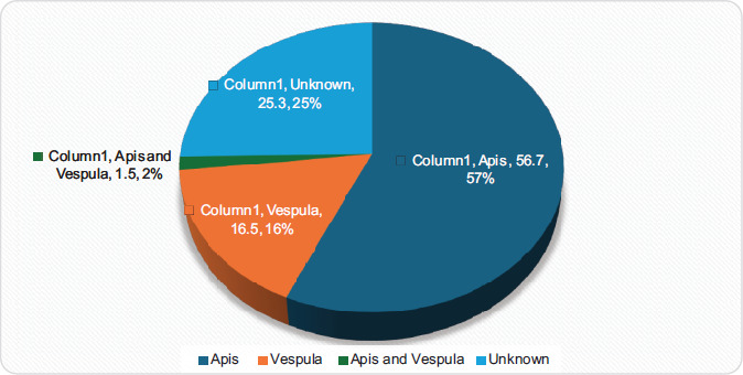 The most common suspected bee species observed in patient histories is Apis, and the others are listed in Figure 2.