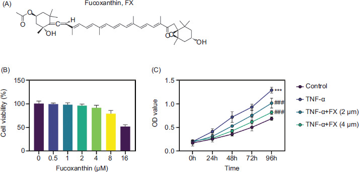 Figure 1 Fucoxanthin inhibits TNF-α-induced proliferation of MH7A cells. (A) Chemical structure of fucoxanthin; (B) MH7A cell viability following treatment with fucoxanthin at concentrations of 0, 0.5, 1, 2, 4, 8, and 16 μM was assessed using the CCK-8 assay; (C) cell viability was further evaluated by measuring OD values in the control, TNF-α, TNF-α + fucoxanthin (2 μM), and TNF-α + fucoxanthin (4 μM) groups; N = 3. P < 0.01, *P < 0.001 vs. control group; ###P < 0.001 vs. TNF-α group.