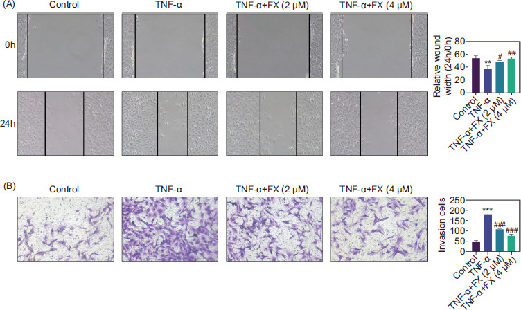 Figure 2 Fucoxanthin suppresses TNF-α-stimulated cell migration and invasion. MH7A cells were divided into control, TNF-α, TNF-α + fucoxanthin (2 μM), and TNF-α + fucoxanthin (4 μM) groups. (A) Cell migration was evaluated using a wound healing assay; (B) cell invasion was assessed using the matrigel-coated transwell assay; N = 3, P < 0.01, *P < 0.001 vs. control group; #P < 0.05, ##P < 0.01, ###P < 0.001 vs. TNF-α group.