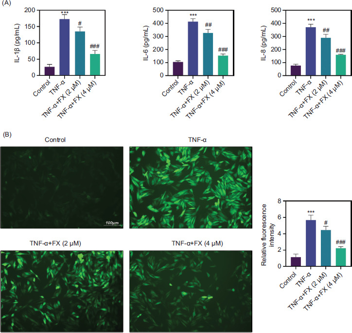 Figure 4 Fucoxanthin alleviates TNF-α-induced inflammation and oxidative stress. MH7A cells were grouped as control, TNF-α, TNF-α + fucoxanthin (2 μM), and TNF-α + fucoxanthin (4 μM). (A) Levels of IL-6, IL-1β, and IL-8 in culture supernatants were measured using ELISA; (B) intracellular ROS levels were assessed using DCFH-DA fluorescence staining; N = 3, *P < 0.001 vs. control group; #P < 0.05, ##P < 0.01, ###P < 0.001 vs. TNF-α group.