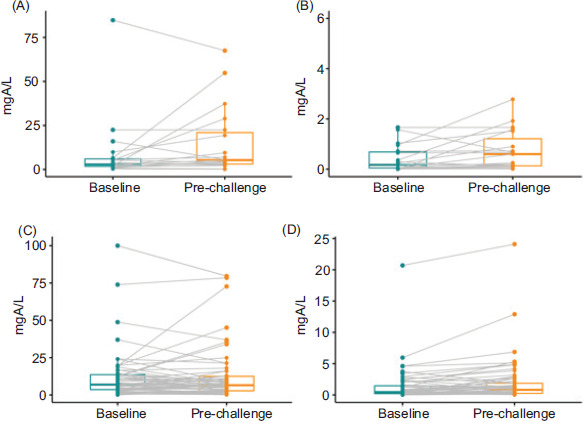 Figure 2 Changes in specific IgE and IgG4 levels against Pru p 3 in tolerant and nontolerant groups. (A) IgE levels against Pru p 3 in the tolerant group. (B) IgG4 levels against Pru p 3 in the tolerant group. (C) IgE levels against Pru p 3 in the nontolerant group. (D) IgG4 levels against Pru p 3 in the nontolerant group. Values are expressed in ngA/L. Medians, interquartile ranges, and individual values are shown, with lines connecting each patient’s baseline and final values. Statistical analysis was performed using the Wilcoxon signed-rank test. A significant increase in IgG4 was observed in both groups (b and d), but not in IgE.