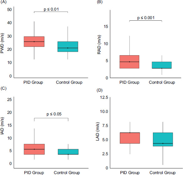 Figure 1 P-wave dispersion and atrial electromechanical conduction periods in PID and control group patients. (A) P-wave dispersion, (B) right atrial delay, (C) interatrial delay, and (D) left atrial delay.