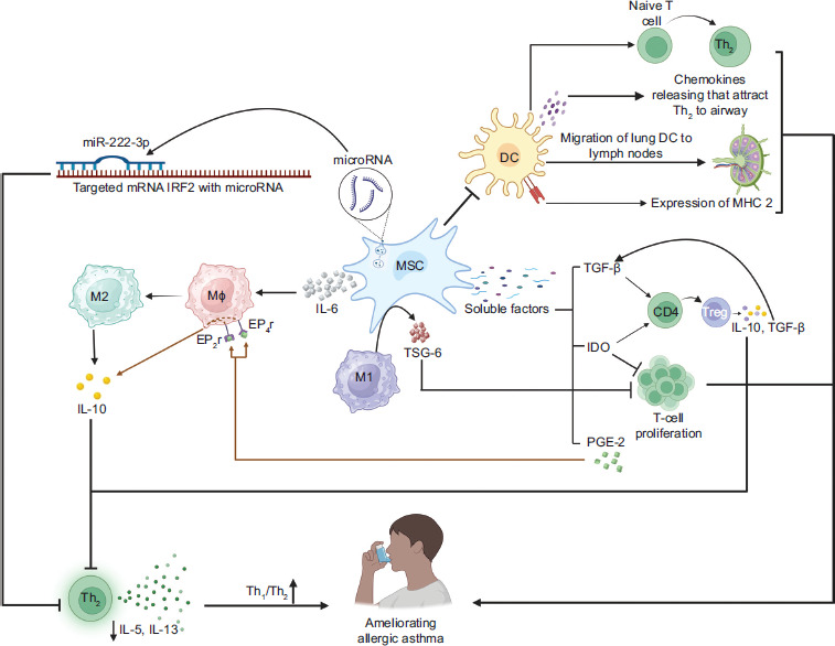 Figure 1 How MSCs exhibit immunosuppressive modulation to induce immune tolerance against asthma. Upregulating miR-222-3p from MSC-derived exosomes reduces the expression of IRF2, which promotes Th2 cell immune responses. Therefore, miR-222-3p expression improves the Th1/Th2 cell ratio in MSCs. The release of soluble factors such as TGF-β, PGE2, and IDO shifts the asthma patient’s environment from pro-inflammatory to anti-inflammatory. MSCs aid in transforming CD4+ T cells into induced Tregs by expressing TGF-β, which produces anti-inflammatory cytokines such as IL-10 and TGF-β, helping balance Th1 and Th2 cells. PGE2 from MSCs activates macrophage EP2 and EP4 receptors, promoting IL-10 production, while IDO suppresses T-cell proliferation and encourages the conversion of naive CD4+ T cells into induced Tregs. MSCs can inhibit DC functions such as directing naive T cells to become Th2 cells, facilitating the maturation and movement of lung DCs to lymph nodes, producing chemokines that attract Th2 cells to the airway, and enhancing MHCII expression for antigen presentation to Th2 cells. Cell contact between MSCs and M1 macrophages enhances TSG-6 production in MSCs, promoting M2-like polarization of macrophages and suppressing T-cell proliferation. Additionally, IL-6 produced by MSCs helps to regulate macrophage polarization toward an IL-10-producing M2-like phenotype.