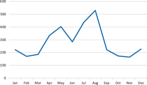 A total of 3351 patients diagnosed with AR were included, comprising 1964 males (58.61%) and 1387 females (41.39%), with a male-to-female ratio of 1.42:1. Among them, 1731 patients (51.66%) were aged <14 years, while 1620 patients (48.34%) were adolescents/adults. Of the 3351 patients diagnosed with AR, the number of clinic visits peaked in August (530 cases) and was lowest in November (164 cases) (Figure 1).