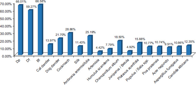Figure 2 Positivity proportions of individual allergens. Df: Dermatophagoides farinae; Bt: Blomia tropicalis; Dp: Dermatophagoides pteronyssinus.