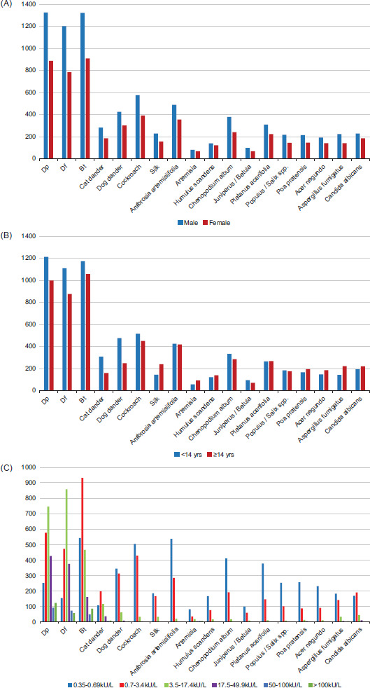 Figure 3 (A) Distribution of allergen sensitization by gender (n). (B) Distribution of allergen sensitization by age (n). (C) Distribution of allergen sensitization by quantitative sIgE class (n). Df: Dermatophagoides farinae; Bt: Blomia tropicalis; Dp: Dermatophagoides pteronyssinus.