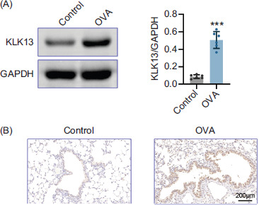 Figure 1 KLK13 was upregulated in OVA-induced mice. (A) The KLK13 expression was examined by Western blot analysis. Protein expressions were normalized to GAPDH. (B) The KLK13 level was examined by immunohistochemistry. Scale bar = 200 µm. ***P < 0.001 vs. the control.