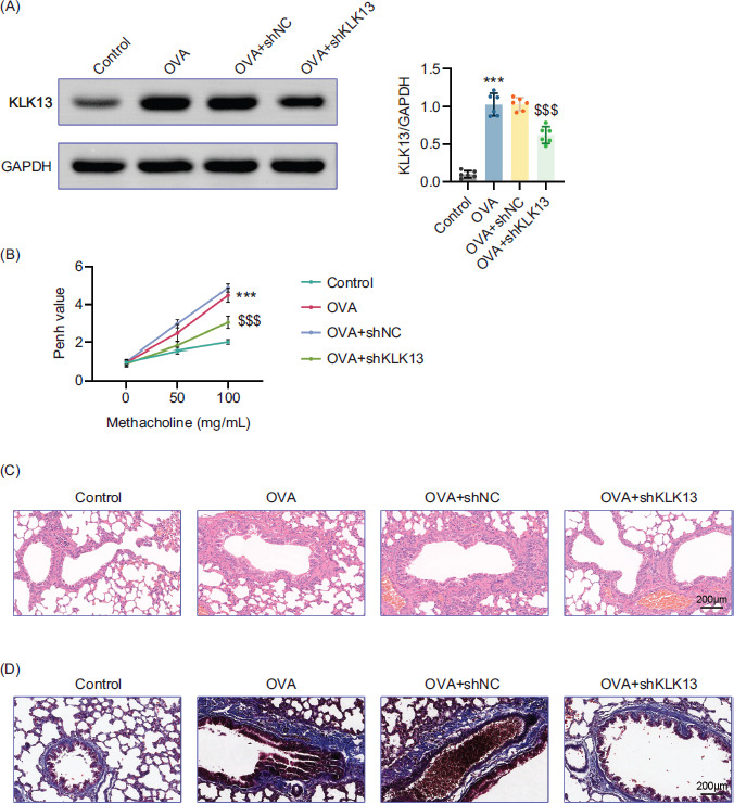 Figure 2 KLK13 knockdown ameliorated AHR and lung histopathological symptoms in OVA-induced mice. (A) The KLK13 expression was examined by Western blot analysis following the injection of LV-packed shKLK13. The protein expressions were normalized to GAPDH. (B) Measurement of AHR. (C and D) Lung tissues were conducted by hematoxylin and eosin (H&E) and Masson staining. Scale bar = 200 µm. ***P < 0.001 vs. the control; $$$P < 0.001 vs. OVA+shNC.