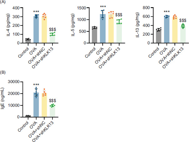 Figure 3 KLK13 knockdown attenuated the inflammatory factors release in OVA-induced mice. (A) The concentrations of IL-4, IL-5, and IL-13 in BALF were examined by ELISA. (B) The concentrations of IgE in sera were examined by ELISA. ***P < 0.001 vs. the control; $$$P < 0.001 vs. OVA+shNC.
