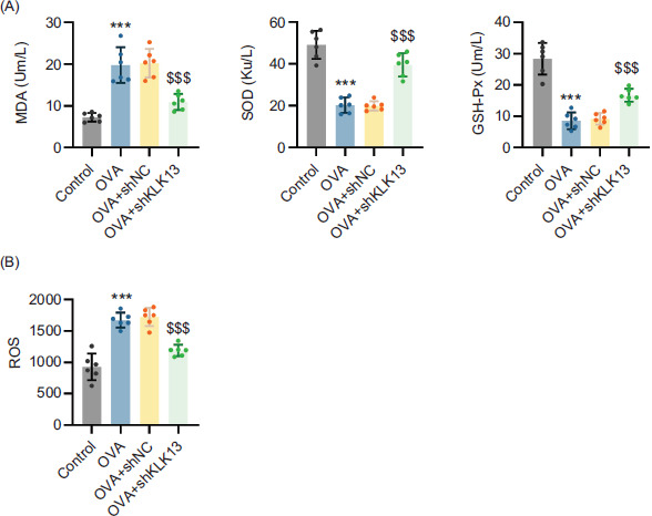 Figure 4 KLK13 knockdown reduced oxidative stress in OVA-induced mice. (A and B) The contents of MDA, SOD, GSH-Px, and ROS in lung tissues were determined by biochemical examination. ***P < 0.001 vs. the control; $$$P < 0.001 vs. OVA+shNC.