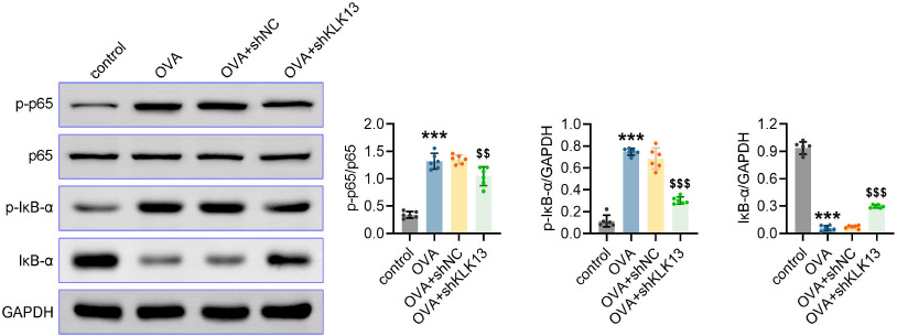 Figure 5 KLK13 knockdown suppressed the activation of NF-κB signaling in OVA-induced mice. The relative protein expression of p65, p-p65, IκB-α, and p-IκB-α was examined by Western blot analysis. Protein expressions were normalized to GAPDH. ***P < 0.001 vs. the control; $$$P < 0.001 vs. OVA+shNC.