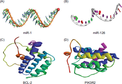 Figure 1 The 3D structure of miR-1, miR-126, BCL2, and PIK3R2.