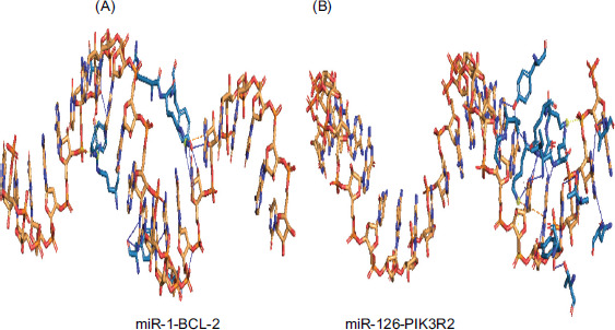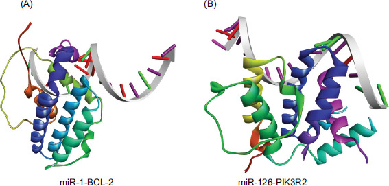 Figure 2 The 3D structure of BCL2-miR1, PIK3R2-miR126 docked complexes.