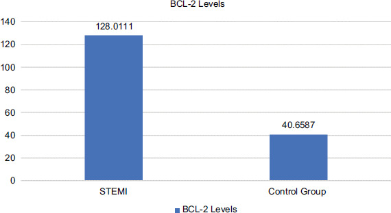 In the current study, BCL2 levels in the STEMI group of 45 participants had a mean of 128.0111 and a standard deviation of 137.19, indicating significant variance around the mean. The control group, which also comprised 45 individuals, had BCL2 levels with a mean of 40.6587 and a lower S.D. of 20.92479. In a related study, Sun et al. (2016) investigated the effects of miR-21 expression on the BCL2/caspase-3 and IL-6/STAT3 pathways in acute MI, showing that individuals with MI express higher levels of miR-21 than normal volunteers. Overexpression of miR-21 may enhance BCL2 protein expression while inhibiting STAT3 protein expression.36 Maclay prospectively included consecutive MI patients undergoing primary PCI, with 29 patients aged 67 ± 12 and 83% males treated for acute MI. Early growth response protein 1 and BCL2 demonstrated a significant correlation (r = 0.657, p < 0.001). Patients with non-STEMI-ACS exhibited lower BCL2 expression than those with STEMI-ACS (2.7 ± 1.2 vs. 4.8 ± 1.0, p = 0.001). In the current investigation, miRNA levels for 90 samples from each group were calculated using the Relative Expression technique. The STEMI group had a mean Ct value of 31.353 with a standard deviation of 68.895, and Ct values ranged from 0.102 to 324.034. The control group’s Ct values ranged from 6.105 to 156.498, with a mean of 43.431 and a standard deviation of 31.285.