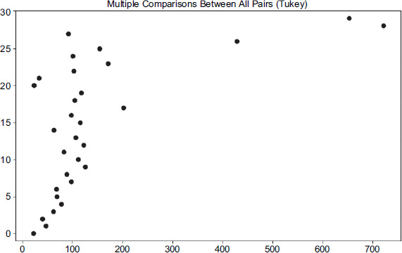 The Shapiro-Wilk Test Statistic showed a value of 0.58, with a p-value of 4.83 × 10−8 (p-value <0.005), indicating that the data is not normally distributed. The Mann-Whitney U Test was applied to a dataset containing BCL2 levels and PIK3R2 levels among STEMI patients, yielding a statistic of 167.0 with a p-value of 2.959 × 10−5 (p-value <0.005). This indicates a significant difference between the BCL2 antibody and PIK3R2 levels, as determined by the Mann-Whitney U test. The Spearman Correlation Coefficient was 0.611, demonstrating a significant correlation between BCL2 antibody and PIK3R2 using Spearman correlation. The levels of BCL2 antibody and PIK3R2 in STEMI are shown in Figure 8. Linear regression evaluation revealed a Mean Squared Error of 158743.74, an R2 score of 0.8494, and a Mean Absolute Error of 239.8. The linear regression model, represented in Figure 9, demonstrated a significant correlation between the two proteins. Multiple comparisons between all pairs of proteins in STEMI were performed using Tukey’s test, showing significant correlations in each pair, as illustrated in Figure 10.