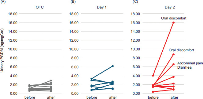 All cases were previously diagnosed with FA and had undergone OFC to determine the dose to be consumed at home, resulting in no symptoms. Following OFC, urine samples were collected prior to and after the introduction of target food for two consecutive days at home. The urinary PGDM concentrations were detected using liquid chromatography–tandem mass spectrometer and corrected for urinary creatinine at the University of Tokyo.5–7