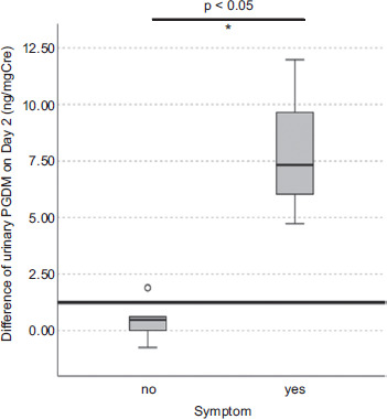 The detailed symptoms and levels of urinary PGDM during home ingestion are shown in Table 2 and Figure 1. Mild symptoms were observed in three cases, despite the dose being lower than that administered during the OFC. Statistical comparison of day 2 PGDM levels according to the presence or absence of symptoms revealed a significant increase in cases with symptoms (Mann–Whitney U test; Figure 2).