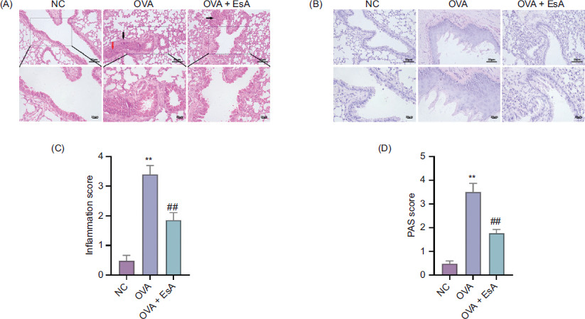 Figure 1 Histological evaluation of airway inflammation and mucus secretion in OVA-induced asthmatic mice with or without EsA treatment. (A–B) Representative images of lung sections stained with H&E (A) and PAS (B) in EsA intervention groups. (C) Inflammation scores based on H&E staining. (D) PAS staining-based goblet cell scores. Data are presented as mean ± SD, n = 8 mice per group. **P < 0.01 vs. NC group; ##P < 0.01 vs. OVA group.
