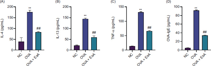 Figure 2 Effects of EsA on Th2-type cytokine production and serum IgE levels in OVA-induced asthmatic mice. (A–C) Levels of IL-4, IL-13, and TNF-β in BALF. (D) The level of OVA-specific IgE in mouse serum. Data are presented as mean ± SD, n = 8 mice per group. **P < 0.01 vs. NC group; ##P < 0.01 vs. OVA group.
