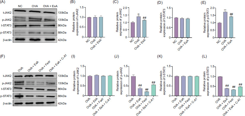 Figure 3 Modulation of JAK2/STAT3 signaling by EsA in OVA-induced asthmatic mice. (A–E) Western blot analysis of t-JAK2, p-JAK, t-STAT3, and p-STAT3 in lung tissues from NC, OVA, and OVA + EsA groups. (F–J) Effects of Fedratinib and C-A1 on EsA-mediated inhibition of JAK2/STAT3 signaling in OVA-challenged mice. Results are shown as mean ± SD, n = 8 mice per group. **P < 0.01 vs. NC group; ##P < 0.01 vs. OVA group.