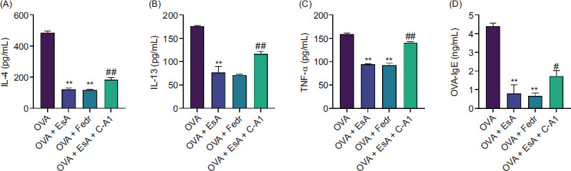To confirm whether the inhibition of JAK2/STAT3 signaling contributes to the anti-inflammatory effects of EsA, levels of Th2-type cytokines and OVA-specific IgE were measured by ELISA. Figures 4A–D demonstrates that OVA-induced mice exhibited markedly elevated levels of IL-4, IL-13, TNF-β, and OVA-specific IgE. Treatment with either EsA or Fedratinib significantly reduced all four markers (P < 0.01), confirming their anti-inflammatory roles. Notably, compared with the group that used OVA + EsA alone, the combined treatment with the JAK2 agonist C-A1 and EsA led to an increase in cytokine and IgE levels (P < 0.01), indicating that the regulatory effect of EsA has a mechanism that is dependent on JAK2. These data further support the involvement of JAK2/STAT3 signaling in mediating EsA’s suppression of airway inflammation and allergic responses.