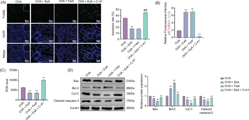 To elucidate whether the JAK2/STAT3 pathway mediates EsA-induced mitochondrial apoptosis in airway epithelial cells, we assessed TUNEL positivity, Δψm, intracellular ROS levels, and apoptosis-related protein expression in the OVA group, OVA + EsA group, OVA + Fedr group, and OVA + EsA + C-A1 group. As shown in Figure 5A, TUNEL fluorescence staining revealed a significantly reduced apoptosis rate in the EsA-treated group and Fedr-treated group compared to the OVA group (P < 0.01), whereas co-administration of EsA and C-A1 reversed this suppression and significantly increased apoptotic cell numbers (P < 0.01). This trend was supported by JC-1 staining (Figure 5B), in which EsA and Fedratinib preserved Δψm (increased JC-1 red/green fluorescence ratio), while the addition of C-A1 markedly reduced Δψm, indicative of mitochondrial depolarization (P < 0.01). Meanwhile, intracellular ROS accumulation (Figure 5C) showed that EsA and Fedratinib significantly decreased ROS levels compared with the OVA group (P < 0.01), whereas C-A1 intervention restored ROS generation (P < 0.01).