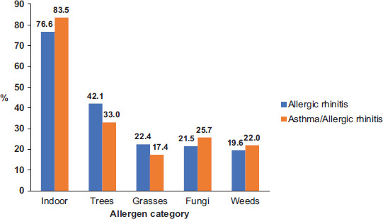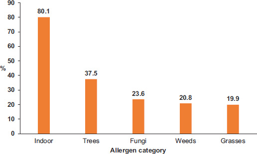 Figure 2 Proportion of allergic sensitization to different groups of aeroallergens; frequencies of sensitization to indoor allergens, trees, grasses, weeds, and fungi are shown in the pediatric population.