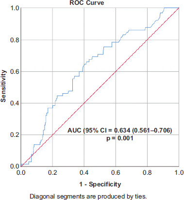 The receiver operating characteristic (ROC) curve analysis for total IgE showed that values ≥110.5 IU/mL predicted confirmed food allergy with 64.6% sensitivity and 59.7% specificity (area under curve [AUC] 0.634; 95% CI: 0.561–0.706; P = 0.001) (Figure 1).