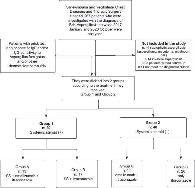 In this retrospective, cross-sectional study conducted at two centers (Süreyyapaşa Chest Diseases and Thoracic Surgery Training and Research Hospital, Istanbul and Yedikule Chest Diseases and Thoracic Surgery Training and Research Hospital, Istanbul), the records of a total of 267 patients with ICD code B44 and its subcodes, documented between 2016 and 2023, were reviewed. Patients with saprophytic aspergillosis (aspergilloma, mycetoma, fungal ball), invasive aspergillosis, and those lost to follow-up were excluded from the study. Patients who underwent regular treatment and follow-up for at least 16 weeks were included in the study. The remaining 70 patients were divided into two groups based on SS use (SS-using vs non-SS) and further subdivided according to treatment composition as antifungal therapy (ıtrakanazol) alone or antifungal therapy combined with the biologic agent omalizumab (Figure 1). The clinical, spirometric, and laboratory parameters of all patients were recorded before treatment and after the 16-week treatment period.
