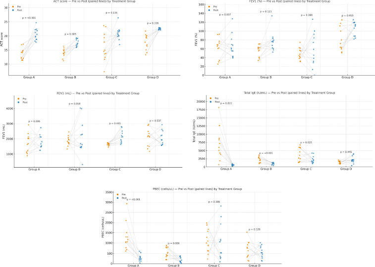 In the SS-using group (Groups A and B), patients receiving omalizumab ± itraconazole (Group A) demonstrated a statistically significant decrease in serum total IgE and PBEC levels, alongside a significant improvement in FEV1 (both mL and % predicted) and ACT scores when comparing pre- and posttreatment values (P < 0.05 for all). Conversely, among those treated with SS+ itraconazole (Group B), a significant reduction was observed only in total IgE, PBEC levels, and ACT, while changes in FEV1 (both mL and % predicted) were not statistically significant.