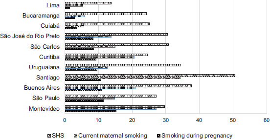 Results: The prevalence of smoking during pregnancy was 8.4%, ranging from 1.4% in Lima to 15.3% in Montevideo; current maternal smoking was 15.3%, from 5.4% in Lima to 34.4% in Santiago; and second-hand tobacco smoke (SHS) at home was 29.8%, from 13.7% in Lima to 50.7% in Santiago. SHS and current maternal smoking were strong and independent risk factors for smoking during pregnancy (p < 0.0001). Low maternal education and monthly household income were significant risk factors for perinatal tobacco exposure. The prevalence and severity of wheezing, admissions for wheezing, pneumonia diagnosis, and admissions for pneumonia were significantly higher (p < 0.0001) in infants exposed to tobacco smoke.