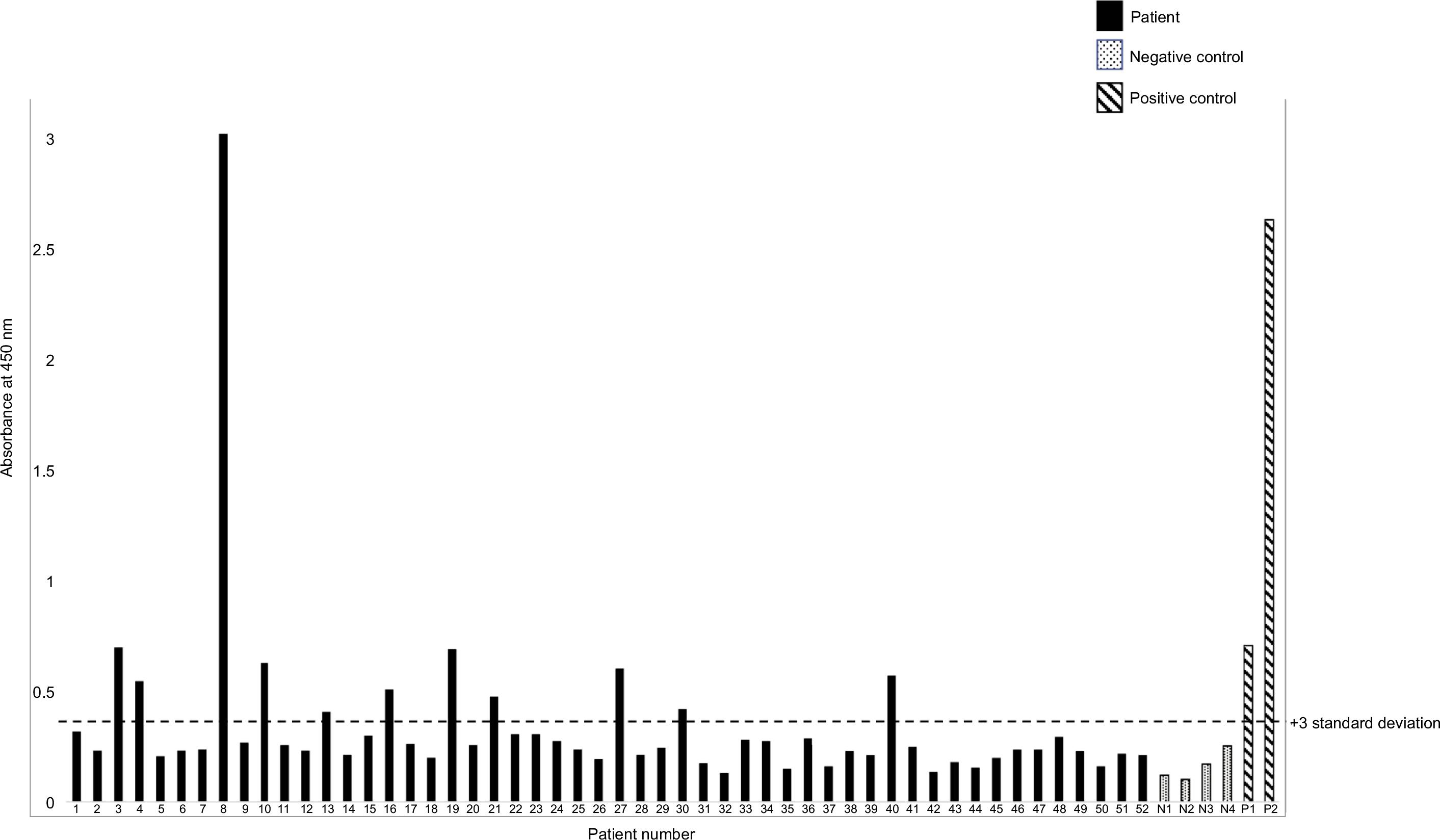 Absorbance was measured at 450 nm using a microplate reader (iMark Microplate Absorbance Reader, Bio-Rad, Hercules, CA). Values that were three standard deviations higher than the mean value of the negative control were considered positive.