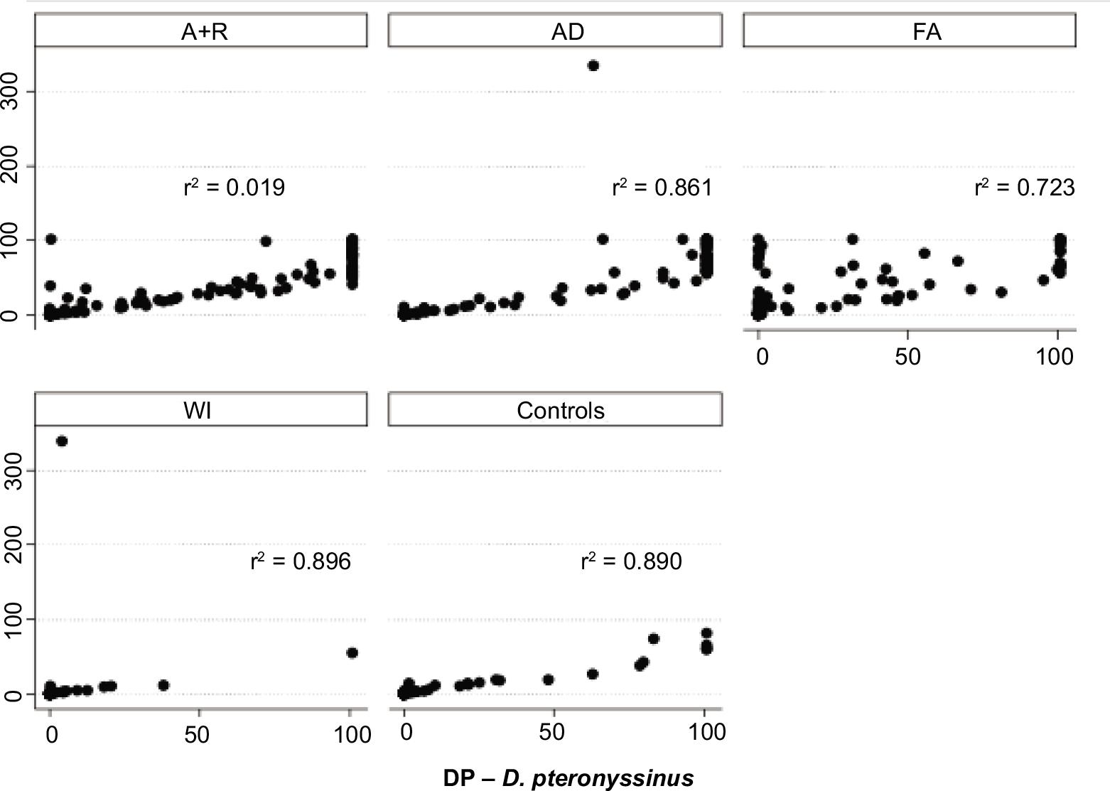 Regarding the diseases evaluated, PhInf showed a very strong correlation with DP in the A+R group (rs = 0.919) and strong for AD (rs = 0.861), FA (rs = 0.732), WI (rs = 0.721) and C (rs = 0.896) groups (Figure 2).