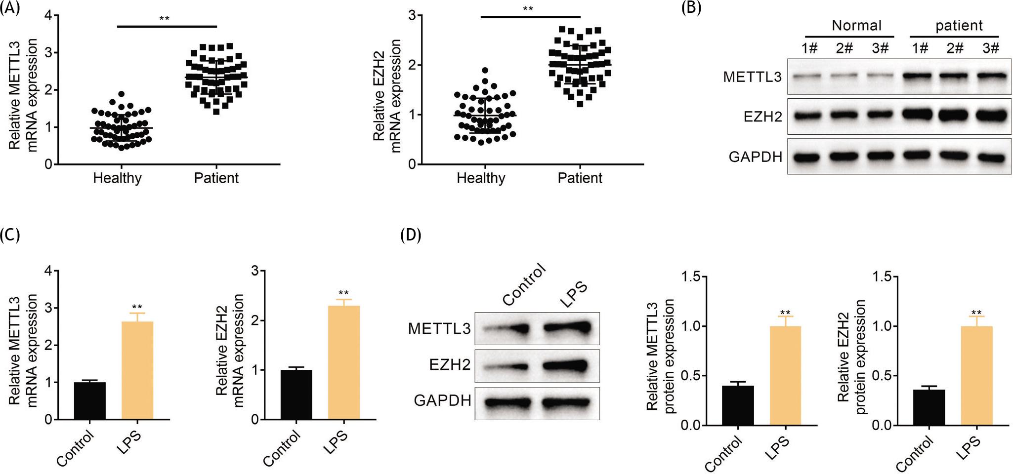 Figure 1 METTL3 and EZH2 were highly expressed in pediatric pneumonia patients and LPS-induced cell models. (A) mRNA and (B) protein expression levels of METTL3 and EZH2 in peripheral blood mononuclear cells (PBMC) obtained from pediatric pneumonia patients (n = 50) and even-aged healthy children (control group, n = 50). (C) mRNA and (D) protein expression levels of METTL3 and EZH2 in WI-38 cells treated with LPS at a concentration of 20 μg/mL, **P < 0.01. GAPDH was normalized as an internal control.