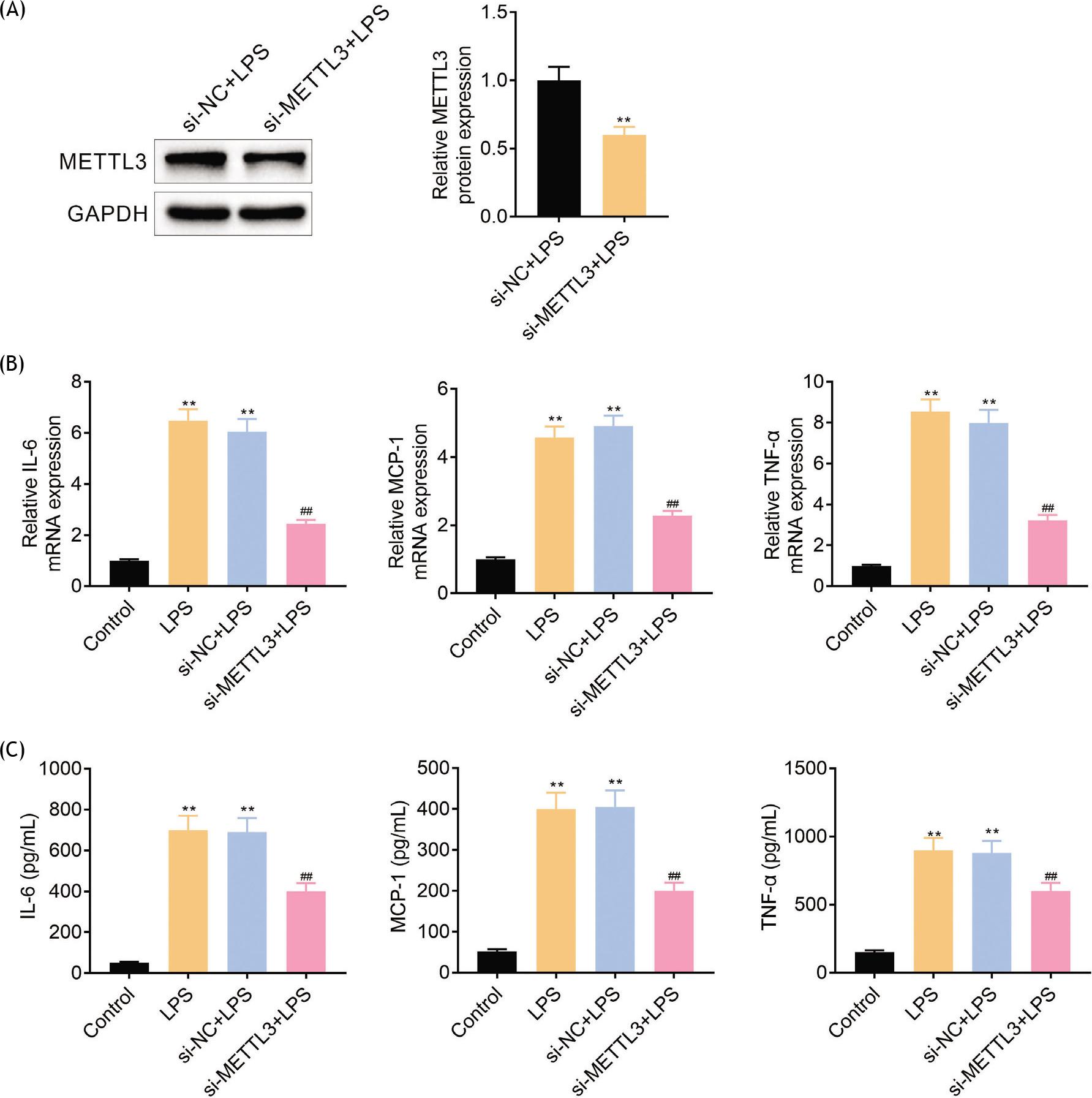 Figure 2 Downregulation of METTL3 abated LPS-induced inflammatory response. (A) The western blot assay results showed the protein expression level of METTL3 in LPS-induced WI-38 cells after transfecting with si-NC or si-METTL3 plasmids, **P < 0.01. GAPDH was normalized as an internal control. (B) RT-qPCR results exhibited the mRNA expression levels of IL-6, MCP-1, and TNF-α in WI-38 cells of control, LPS, and si-NC+LPS and si-METTL3+LPS groups, **P < 0.01. (C) ELISA results showed the contents of IL-6, MCP-1, and TNF-α in WI-38 cells of control, LPS, and si-NC+LPS and si-METTL3+LPS groups, **P < 0.01. ##Comparison between si-METTL3+LPS and si-NC+LPS groups.