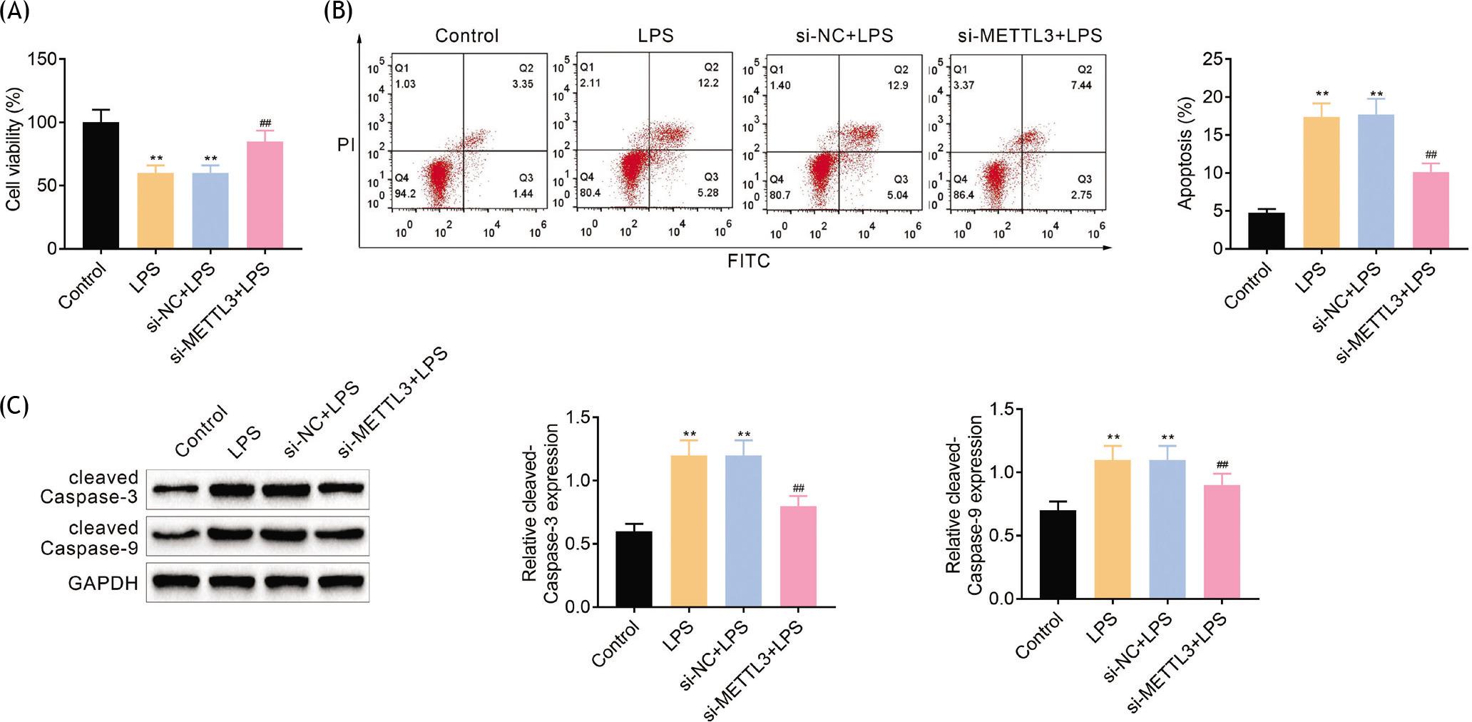 Figure 3 Downregulation of METTL3 inhibited LPS-induced apoptosis. (A) MTT and (B) flow cytometry assays detected cell viability and apoptosis rate in WI-38 cells of control, LPS, and si-NC+LPS and si-METTL3+LPS groups, **P < 0.01. (C) Western blot analysis results exhibited the expression level of cleaved caspase-3 and cleaved caspase-9 in control, LPS, si-NC+LPS, and si-METTL3+LPS groups, **P < 0.01. GAPDH was normalized as an internal control. ##Comparison between si-METTL3+LPS and si-NC+LPS groups.