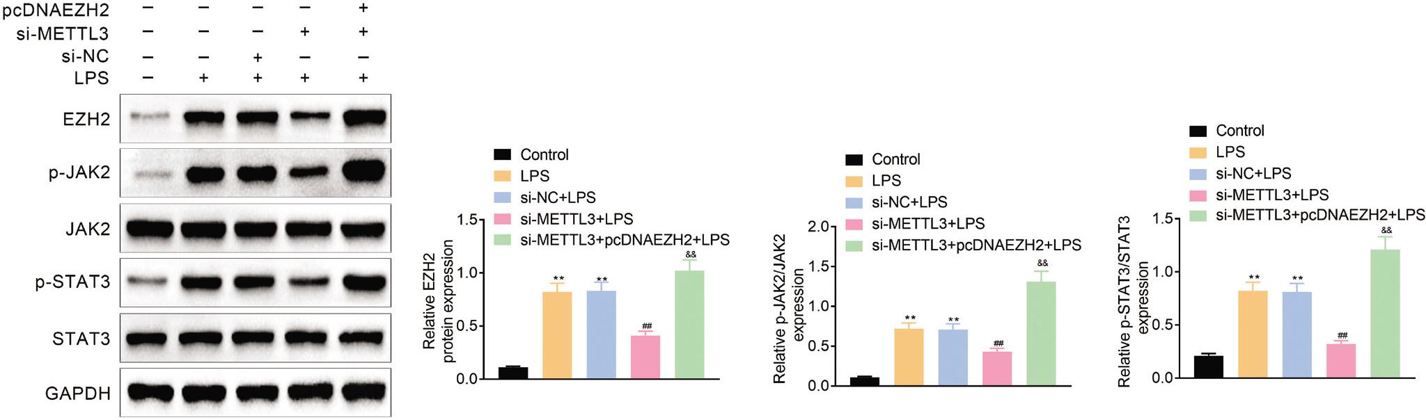 Figure 4 METTL3 regulated the JAK2–STAT3 signaling pathway via EZH2. The protein expression levels of EZH2, p-JAK2, JAK2, p-STAT3, and STAT3 in WI-38 cells of control, LPS, si-NC+LPS, si-METTL3+LPS, and si-METTL3+pcDNAEZH2+LPS groups, **P < 0.01. GAPDH was normalized as an internal control. ##Comparison between si-METTL3+LPS and si-NC+LPS groups. Comparison between si-METTL3+pcDNAEZH2+LPS and si-METTL3+LPS groups.