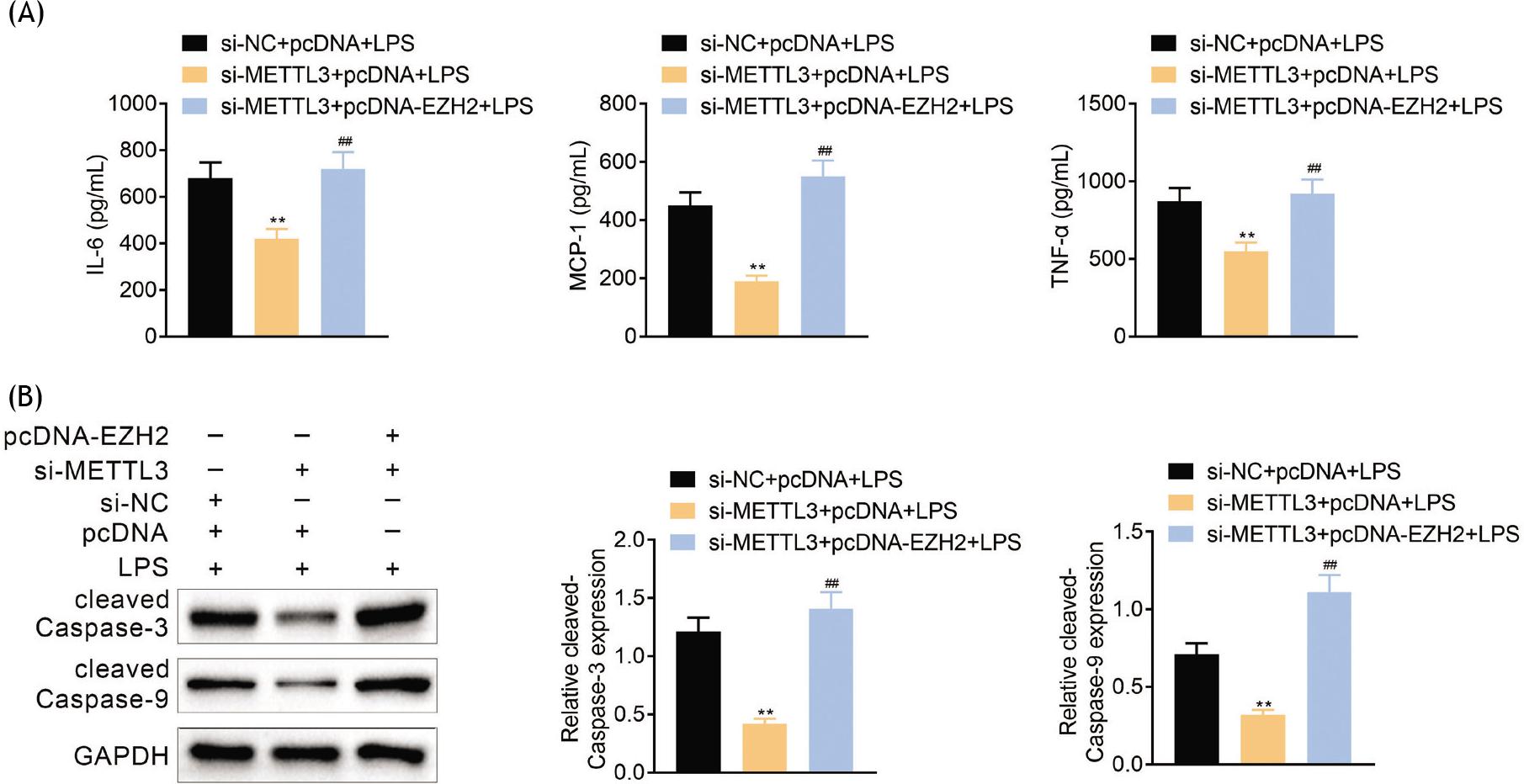 The contents of IL-6, MCP-1, and TNF-α were examined by ELISA. The results established that the contents of IL-6, MCP-1, and TNF-α decreased by different degrees in si-METTL3+pcDNA+LPS group compared with si-NC+pcDNA+LPS group whereas overexpression of EZH2 reversed the anti-inflammatory effect of si-METTL3 (Figure 5A) (P < 0.01). Results of western blot revealed that the expression levels of cleaved Caspase-3 and cleaved Caspase-9 decreased in si-METTL3+pcDNA+LPS group compared with si-NC+pcDNA+LPS group whereas overexpression of EZH2 reversed the apoptosis inhibited by si-METTL3 (Figure 5B) (P < 0.01). These two experiments validated that downregulation of METTL3 robustly suppressed inflammatory response and apoptosis via EZH2.