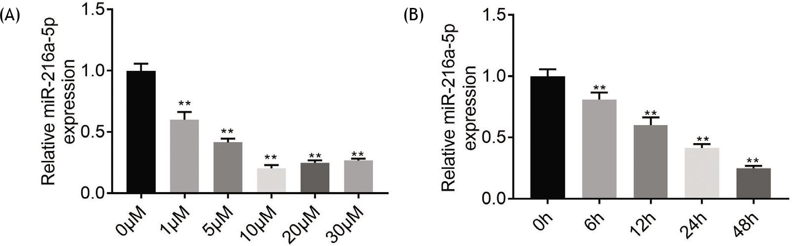 Figure 1 miR-216a-5p was down-regulated in LPS-induced BEAS-2B cells. (A) The expression of miR-216a-5p was detected using qRT-PCR in BEAS-2B cells treated with 0, 1, 5, 10, 20, or 30 μM LPS, respectively. The experiment was performed in triplicates. (B) The expression of miR-216a-5p was detected using qRT-PCR in BEAS-2B cells treated with 10 μM LPS for 0, 6, 12, 24, or 48 hours, respectively. The experiment was performed in triplicates. **P < 0.01.