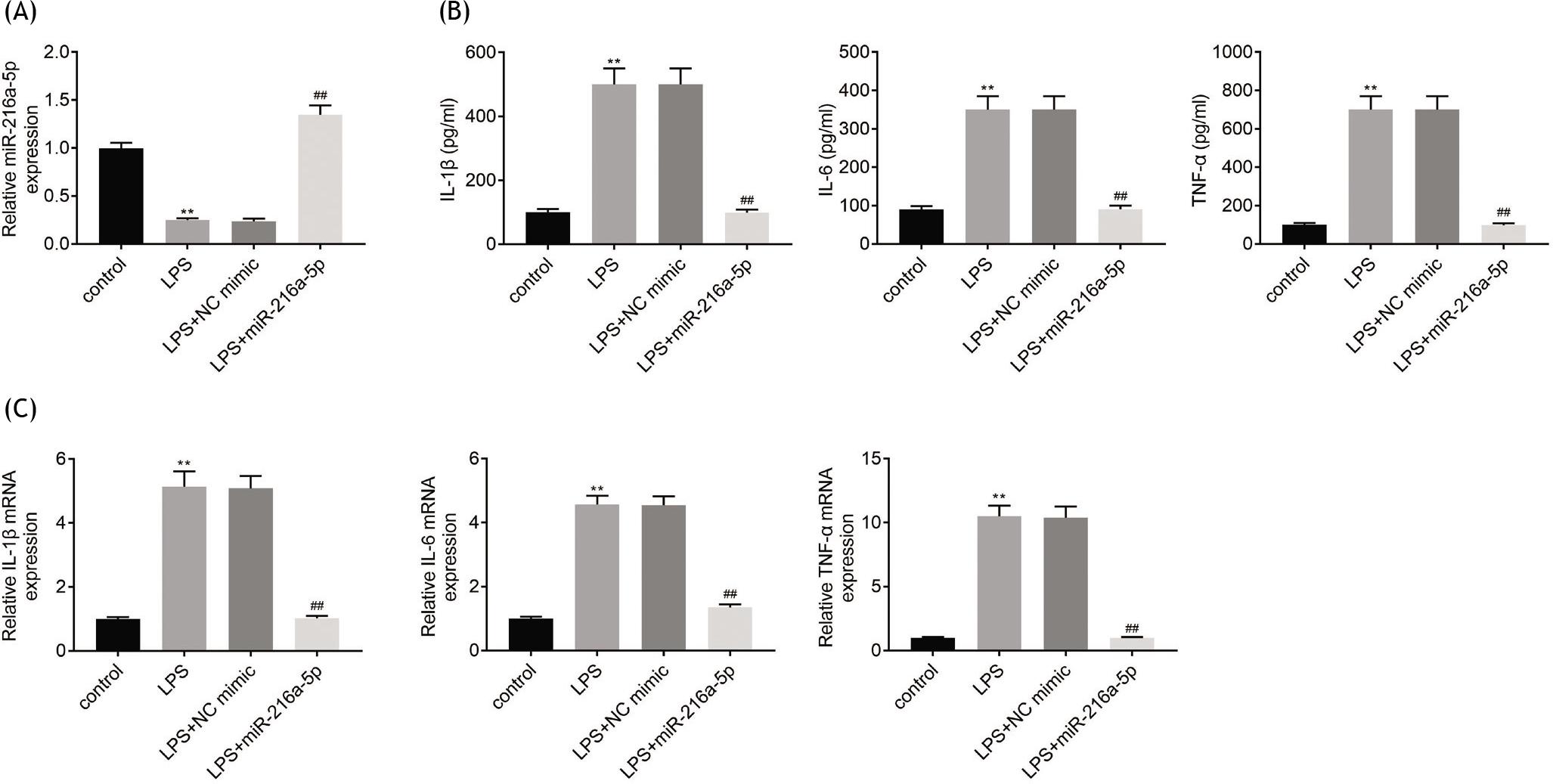 Figure 2 miR-216a-5p suppressed LPS-induced inflammation in BEAS-2B cells. (A) qRT-PCR was used to determine miR-216a-5p expression after BEAS-2B cells were transfected with miR-216a-5p mimic and treated with LPS. The experiment was performed in triplicates. (B) The levels of IL-1β, IL-6, and TNF-α in BEAS-2B cells transfected with miR-216a-5p mimic and treated with LPS were determined using ELISA assay in triplicates. (C) The mRNA expression levels of IL-1β, IL-6, and TNF-α in BEAS-2B cells transfected with miR-216a-5p mimic and treated with LPS were determined by qRT-PCRin triplicates. **P < 0.01. ##P < 0.01.